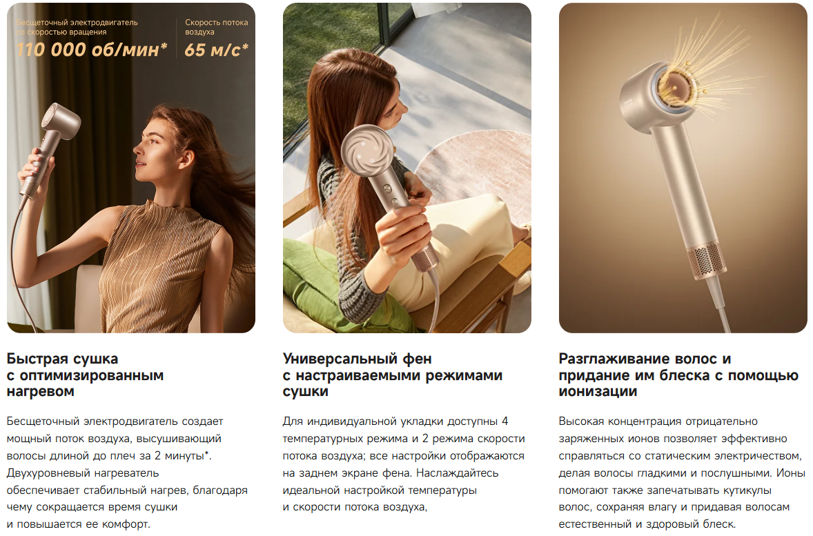 Мощность 1600 Вт обеспечивает эффективную сушку без излишнего перегрева волос. Высокоскоростной мотор с частотой вращения до 110 000 об/мин формирует стабильный и мощный воздушный поток, сокращая время укладки.