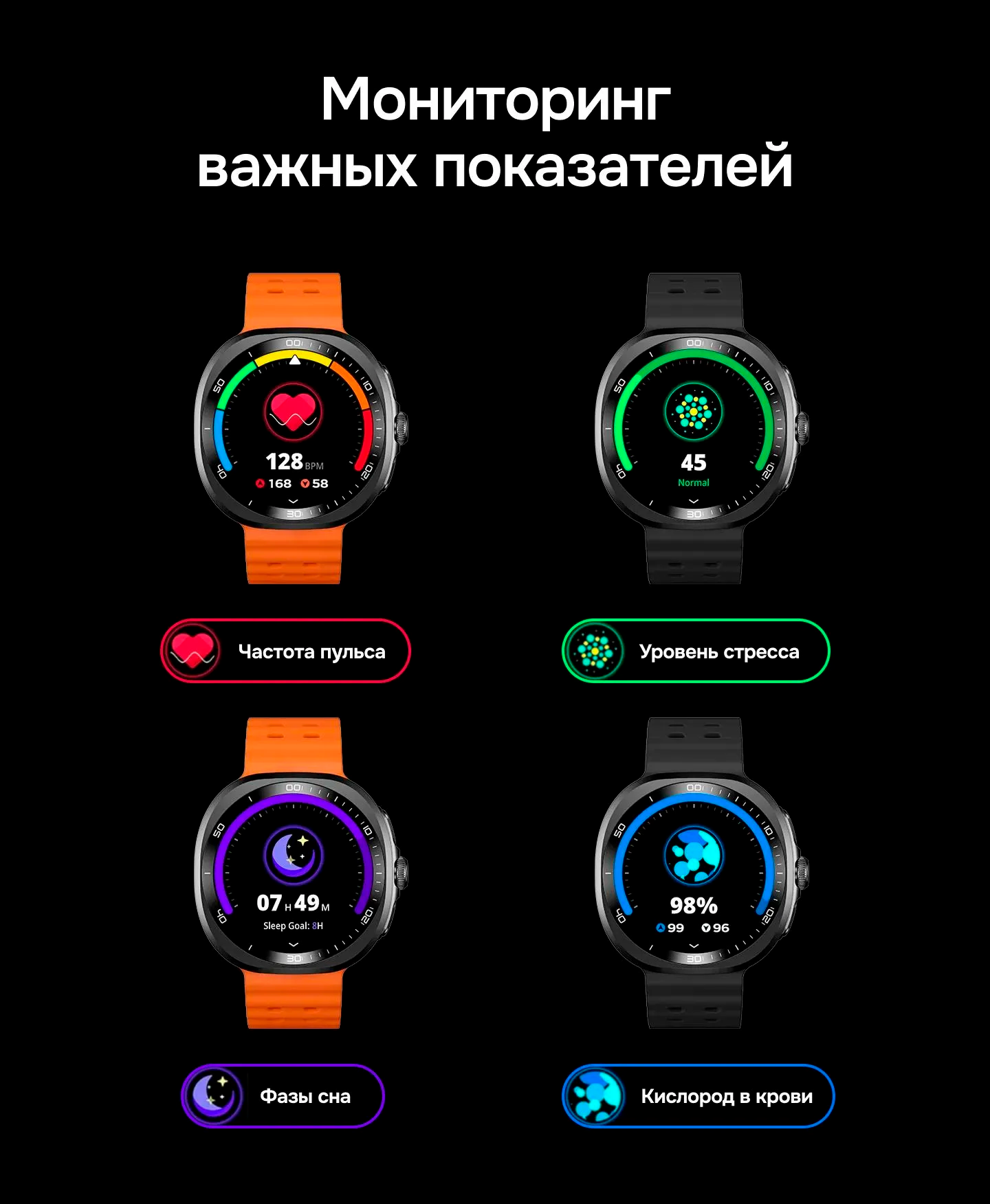 Смарт-часы поддерживают различные функции мониторинга здоровья: измерение уровня кислорода в крови, сердечного ритма, уровня стресса и анализ сна.